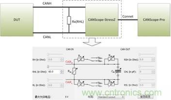 由此可見,該方法雖然可以大致測(cè)量出CAN節(jié)點(diǎn)的差分電平位信號(hào)特征,但由于其用于做分析的樣本很少,測(cè)量方式有很難操作,所以為了提高測(cè)量結(jié)果的準(zhǔn)確度,減低人工成本,文章中對(duì)測(cè)試方法進(jìn)行了改進(jìn),使用CANScope-Pro總線分析儀、CANScope-StressZ擴(kuò)展板,使用配套軟件的樣眼圖與對(duì)稱性測(cè)試進(jìn)行測(cè)量。