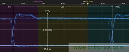 3. 通過(guò)光標(biāo),先測(cè)量出眼圖信號(hào)末端的幅值,如圖3所示,為2.15V。然后再測(cè)量bit前半段的最大幅值,如圖4所示為2.73V。則2.73/2.15=127%,符合GMW3122。