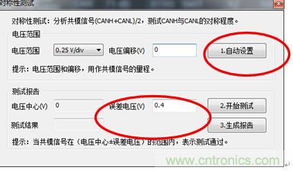 注意:由于GMW3122規(guī)定CANH+CANL的電壓要在4.2V~5.8V,而正常為5V。所以在采用對(duì)稱性測(cè)試時(shí),其中使用的是(CANH+CANL)/2進(jìn)行判別。 所以標(biāo)準(zhǔn)范圍為2.1V~2.9V,正常為2.5V。因此圖7中誤差電壓需要填入0.4。