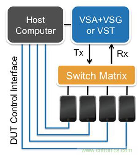 此類因素顯著增加了測試時間,繼而增加了測試成本。新的解決方案是芯片組供應商、測試廠商以及最終用戶通過并行測試多臺 設備來最大限度提高效率,這一方法也稱為“多DUT”測試。通過利用最新的多DUT測試軟硬件架構,設備制造商可以顯著增加他們的生產測試吞吐量而不會增加測試成本。這里來研究和比較各種多DUT測試方案,其中圖2所示的方案是使用一個VSA+VSG或VST通過一個開關矩陣來測試4個DUT。