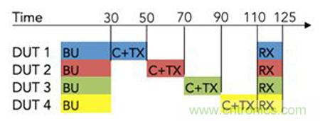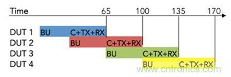 利用多線程并行軟件架構和外部開關電路,已經完成啟動的DUT在執行TX和RX測試時,并行軟件線程可控驅動下一個DUT的啟動過程,從而實現測試的流水線執行。這種方法減少了儀器的停機時間,縮短了高達35%的測試時間,如圖4所示。