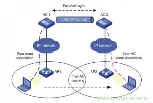 AC間漫游(Inter-AC roaming):一個無線終端從AC的AP漫游到另一個AC內的AP中,即稱為AC間漫游。如圖2所示。