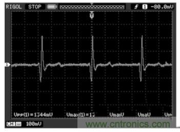 受測者佩戴心電電極,用醫用導聯線接入到模擬前端采集電路,后端接入示波器,待信號穩定后就可以在示波器上觀測到心電信號波形,圖5 即為模擬前端電路實際測試波形圖。