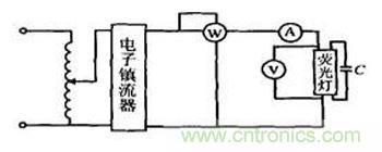 電工學和電路原理課程中有測試熒光燈電路功率因數實驗,通常功率因數測量有兩種方法:一是利用功率因數表;二是利用圖2所示的三表法,即功率表、電壓表、電流表。有的用電子鎮流器與電感式鎮流器啟動熒光燈做比較實驗,讓學生明白提高線路功率因數的意義,但在做比較實驗時主要存在兩個問題: