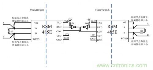 方案一用的是內(nèi)部支持自收發(fā)的RSM485PHT系列,UART端交叉連接即可。方案二用的是常規(guī)帶收發(fā)控制引腳的隔離485,需多用非門電路對(duì)收發(fā)進(jìn)行控制。