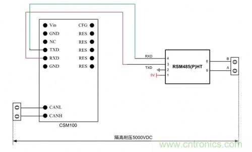 RS485和CAN雖然物理層都是差分傳輸,但因CAN多了更多的底層協(xié)議,兩者不能通過簡單的方式直接轉(zhuǎn)換。此時(shí),使用如圖6所示的CSM100+RSM485模塊方式,利用CSM100能將CAN轉(zhuǎn)成UART數(shù)據(jù),再用RSM485PHT將UART轉(zhuǎn)成RS485電平,實(shí)現(xiàn)RS485轉(zhuǎn)CAN的功能。