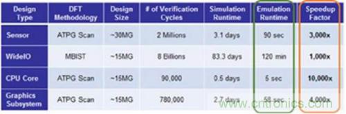 硬件加速仿真的執行速度比軟件仿真高出幾個數量級,而不是小幅增加。在硬件加速仿真中運行 DFT 模式時,某些衡量標準提高了四到五個數量級。參見表 1。