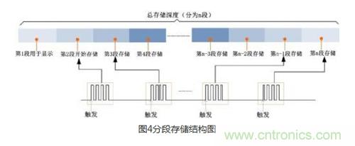 原理如下圖所示:總的存儲深度分為n段,第1段用于顯示,第2段開始存儲,也就是當發生第一次觸發時采集的數據存儲到第2段存儲空間中,當第2段存儲空間存儲滿之后,結束第一次觸發,等待第二次觸發的到來,觸發后把數據存儲到第3段存儲空間中,以此類推。
