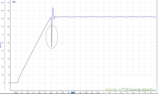 某使用PWM波形驅動的直流電機在加速過程中存在微小抖動情況,觀察電機轉速波形如圖3所示,開始加速后大約在3.6秒轉速出現一個下拉動作。電機PWM調速原理是通過改變接通脈沖的寬度,使直流電機電樞上電壓的占空比改變,從而改變電樞電壓的平均值,控制電機的轉速。因此基本可以確定這個轉速下拉動作是由于PWM波占空比出現異常引起的。