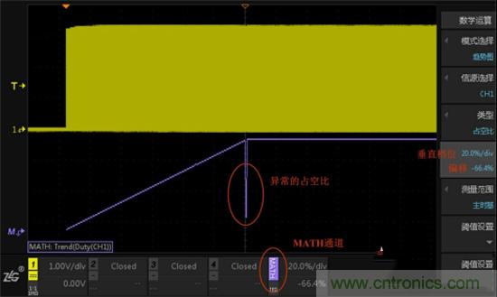 這個時候用ZDS4000系列示波器新開發獨特的占空比趨勢測量功能,將每一個PWM波的占空比顯示在屏幕上,點擊示波器數學運算Math按鍵,模式選擇趨勢圖,類型選擇占空比,示波器會自動檢測PWM波的周期和閾值,無需過多設置,就可以快速出波形,波形如圖5所示。屏幕上除了通道1,還多了MATH通道,顏色為紫色,MATH通道顯示的即是占空比趨勢,可以看到占空比緩慢遞增后大約在屏幕中間位置出現了異常。和通道1一樣,MATH通道也可以調節垂直檔位和偏移。
