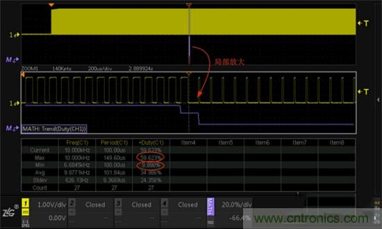 定位到占空比異常位置后,開啟示波器縮放模式下ZOOM多窗口顯示功能,對信號進行局部放大,如圖6所示,可以清晰的看到占空比異常的細節,同時開啟對ZOOM1窗口數據的測量和統計,可以看到占空比從正常的59.62%變為9.99%左右。