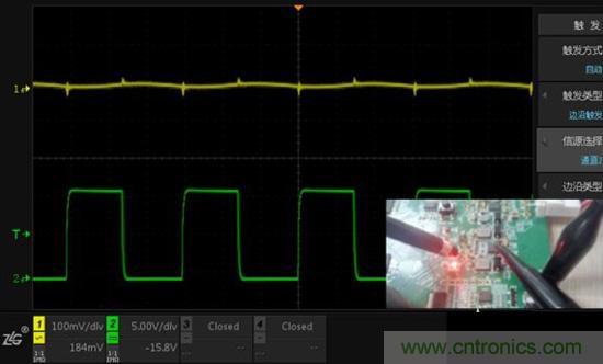 圖3.CH1使用夾子測(cè)量電源輸出,CH2使用夾子測(cè)量電感,單點(diǎn)接地