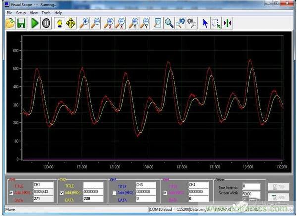 LDO本身的電壓輸出非常穩定,由于筆者ADC采樣為10位,在手指未放入傳感器時,電壓值幾乎保持在3/1024以內跳動。所以筆者默認這款LDO能達0.3%以下的精度。下圖便是筆者關于LDO給模擬部分供電后的心率采樣波形。紅色為一階低通濾波前的波形,黃色為低通濾波后的波形。對實時性要求不高的系統來說,這樣的模擬量波形已經能夠滿足項目的需求。