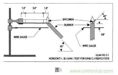 支架的材料進(jìn)行測試,樣品的尺寸為200mm×50mm,延縱向纏繞在直徑為12.7mm的棒上,樣品垂直夾持,樣品底端距燃燒器管的頂端的距離為95mm,噴燈垂直放置,對樣品施加3s的火焰,撤離火焰距試樣至少150mm的距離,以免影響試樣的續(xù)燃,等到試樣停止燃燒,立即再對試樣施加3s的火焰。如果在每次施加火焰過程中,樣品有掉下溶化物或燃燒物,則燃燒器要傾斜到45度,且在施加火焰的過程中,燃燒器在樣品未重疊區(qū)域稍微移動一些,以免滴落物滴進(jìn)噴管。
