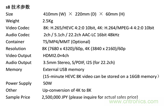 在此背景下,索喜科技研發(fā)了可最大限度使用8K超高精細(xì)高影像的媒體播放器s8。s8搭載索喜科技獨(dú)自研發(fā)的解調(diào)器LSI“SC1400A”,可對(duì)HEVC 8K影像輸入進(jìn)行實(shí)時(shí)解碼,與影像數(shù)據(jù)再生相比,可以實(shí)現(xiàn)體育賽事、演唱會(huì)等的8K直播。此外,還能對(duì)H.264/MPEG-4壓縮的4K影像進(jìn)行解碼處理,甚至是將4K影像提升至8K(超解像處理)。