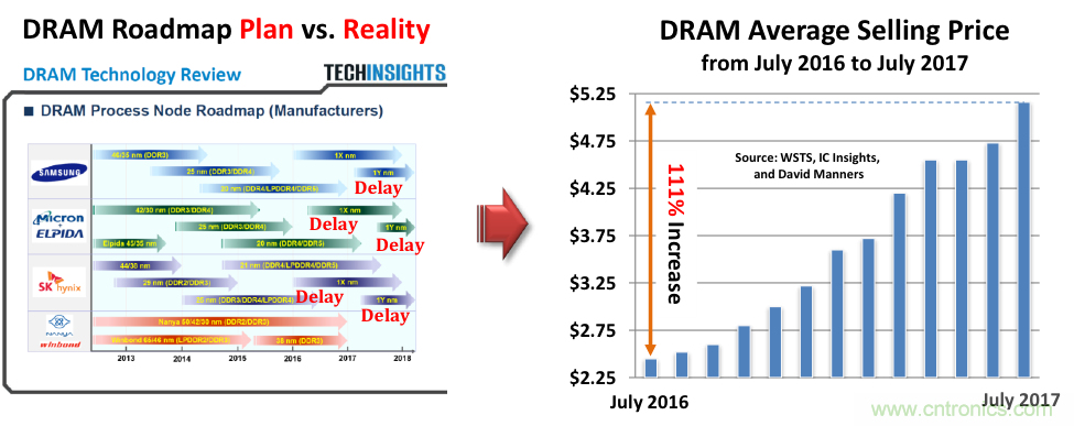 圖1:DRAM發展藍圖的計劃與現實。(來源:WSTS、IC Insights、David Manners)