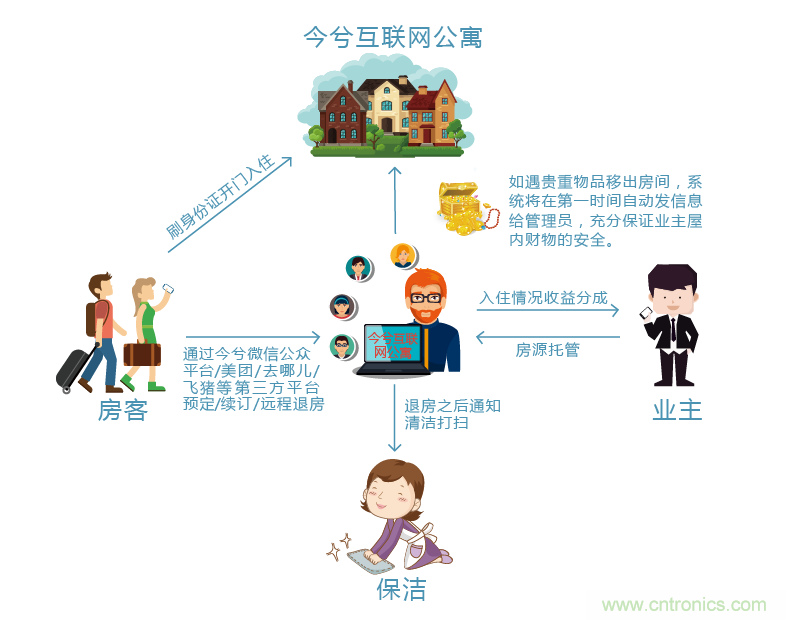 今兮無人值守酒店旨在為短期出行人群打造私享、自由、便捷、安全型的優質住宿體驗,所以旗下全部住宿空間均采用現代智能身份證識別安全門鎖,入住僅需刷身份證開門,自動登記身份證信息,實現了網絡預訂、自助入住、續住、遠程退房的全流程無前臺的服務模式。         今兮互聯網公寓對傳統酒店管理各環節進行了優化,將預訂、入住、退房、保潔、維修、結算整個過程無縫對接起來,各方參與人員通過手機實現連接,提高管理效率,節省酒店的管理成本,也提升了住客的居住體驗。