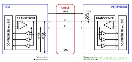2. 它必須管理USB電纜上的雙向通信,確保其收發器在適當的時候進行發送和接收,并精確重現所有驅動和空閑狀態。若要精確重現空閑狀態,它必須在其上游側配置上拉電阻,以模擬連接下游外設的上拉電阻狀態。它在下游側也需配置下拉電阻。必須監控總線上表示總線空閑、分組開始和分組結束的信號,以便正確響應這些狀況。