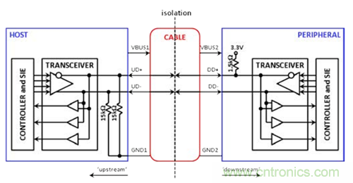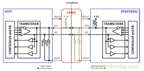 一種可能的隔離方法如圖2a所示。圖中,虛線表示隔離在理論上將USB電纜分割。D+和D–的狀態信息可以跨越隔離柵,但電流不能。GND1節點(上游的接地基準)現在與GND2節點(下游的接地基準)相互分離。不幸的是,隔離使主機無法“看到”下游的上拉電阻,而外設無法“看到”上游的下拉電阻。因此,需要使用一些額外的電阻,如圖2b所示,以便跨越隔離模仿相應連接。在這個“透明”概念中,主機與外設之間的通信方式和圖1中的非隔離式連接十分類似。透明的USB隔離器元件可方便地插入收發器和USB電纜之間,并使用隔離電源。原本設計用于非隔離式應用的主機和外設可方便地連接USB隔離器并交換標準USB信號,無需大幅改動設計。