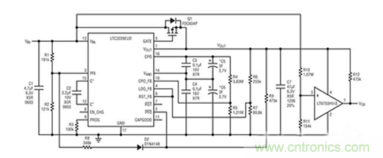 高性能手持式設備需要能夠為設備提供足夠長時間供電的電源后備系統(tǒng),以在電池突然被拿掉時可安全地保存易失性數(shù)據(jù)。超級電容器可在此類系統(tǒng)中充當緊湊和可靠的電源,但是它們需要用于充電及輸出電壓調節(jié)的專用控制系統(tǒng)。LTC3226通過把一個兩節(jié)超級電容器充電器、PowerPath 控制器、一個 LDO 穩(wěn)壓器和一個電源故障比較器全部集成在單個3mm x 3mm 16引腳 QFN 封裝之中,使得能夠輕而易舉地構建一款完整的電源后備解決方案。