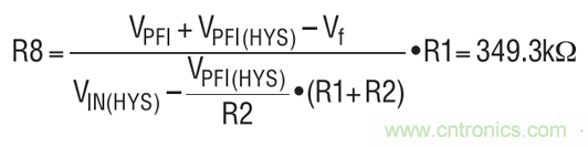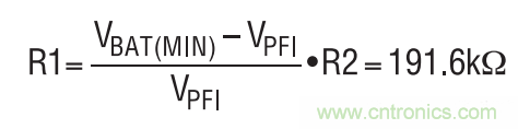 設計從設定 PFI 觸發(fā)電平開始。R2 被設定為 121k, R1 的阻值應把 PFI 引腳上的 PFI 觸發(fā)電平 (VPFI) 設定至1.2V,其計算公式如下: