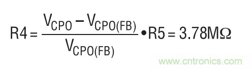 串聯(lián)連接的超級電容器上的滿充電電壓被設定為5V。這是利用位于 CPO 引腳與 CPO_FB 引腳之間的一個分壓器網(wǎng)絡完成的。R5 設定為 1.21M,并計算 R4阻值。VCPO(FB)為1.21V。