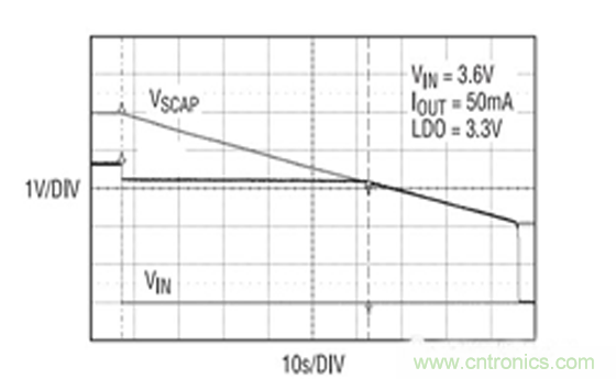 每個超級電容器均選擇為一個由 Nesscap 公司提供的3F/2.7V電容器(ESHSR-0003C0-002R7)。圖 2 示出了在具有一個 50mA 負載時系統(tǒng)的實際后備時間。由于在實際電路中使用了較大的 3F 電容器,因此后備時間為55.4s。