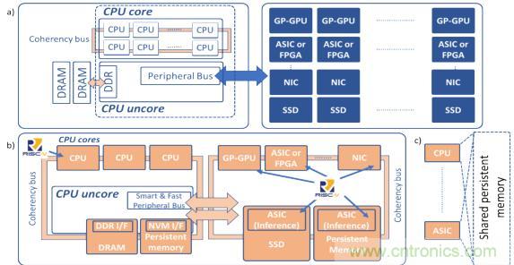 CPU 外圍核心及網絡接口控制器的作用將成為支持數據移動的關鍵因素。CPU外圍核心組件必須支持密鑰內存和永久內存接口(例如NVDIMM-P),也必須支持駐留在CPU附近的內存。還需要實施面向計算加速器、智能網絡和遠程持久內存的智能快速總線。這種總線上的任何設備(例如CPU、通用或專用計算加速器、網絡適配器、存儲器或內存)都可以包含其自己的計算資源并具有訪問共享內存的能力(圖2b和圖2c)。