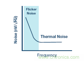 集成輸入緩沖器還有其它挑戰。Σ-Δ 型調制器可在低頻率時提供極低噪聲,但所有其它元件(比如輸入緩沖器)都會使熱噪聲增加,而更嚴重的則是低頻閃爍噪聲,如圖 4 所示。