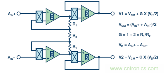這種容性架構結合了儀表放大器的優勢,具有極高的輸入阻抗(因為輸入阻抗是一個電容),其優勢是電容(而不是電阻)作為增益元件,增加了放大器的動態范圍——這不僅是因為它的信號擺幅,還因為其噪聲效率的緣故。