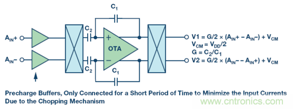 輸出去斬波機制將輸入頻率解調回基帶,同時向上調制緩沖器產生的失調和閃爍噪聲至較高頻率,隨后由 ADC 低通濾波器加以消除。
