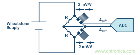 應變計的靈敏度通常為 2 mV/V。惠斯登電源越高,靈敏度也就越高。為了增加應變計的動態范圍并最大化 SNR,電橋可能采用比 ADC 更高的電源供電。