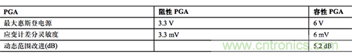 表 1. 惠斯登電橋中的阻性 PGA 和容性 PGA 對比(假設使用標準電源和增益)