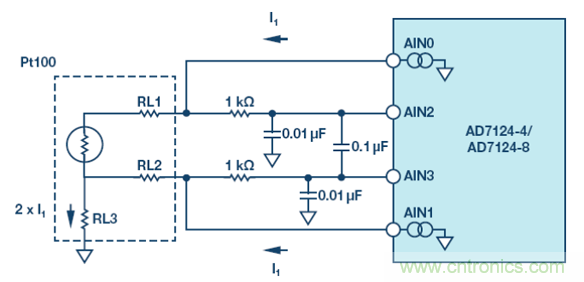 測量溫度并消除引線誤差的傳統方法如圖 10 所示。本例中,集成 PGA 的 Σ-Δ 型 ADC AD7124-8 的內部電流源以相同電流驅動雙線式 RTD,在兩個引線上產生相同的失調誤差,其值與引線電阻成正比。