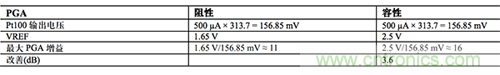 表 2 總結了阻性 PGA 相對于容性 PGA 的最大增益,最大電流源為 500 µA,限制了 Pt100 的自發熱(假定 B 類 RTD,此時最高溫度為 600°C,最大 VREF 為 2.5 V)。