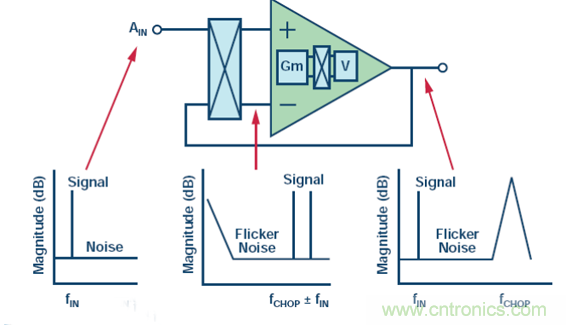 對輸入進行斬波之后,輸入頻率便調制到較高頻率。緩沖器失調和閃爍噪聲依然保持其最初的低頻率,因為它們不受輸入斬波的影響。
