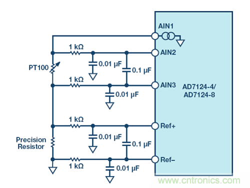 使容性 PGA 性能與阻性 PGA 相當的可行辦法是以更高的電源電壓對電橋供電。比如,以±3.3 V 雙極性電源對電橋供電,從而增加應變計的靈敏度,但代價是更高的系統復雜性和功耗。可能會得益于容性 PGA 的另一個例子是采用電阻式溫度檢測器(RTD)或熱電偶的溫度測量應用。常用 RTD 電阻(比如 PT100)可以用來直接檢測溫度,或間接檢測熱電偶的冷結,如圖 9 所示。