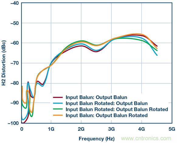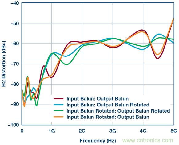 乍一看相當簡單,但魔鬼隱藏在細節中。圖3顯示了一組HD2測試結果,其系使用本框圖中的所有器件、差分放大器、巴倫、衰減器等得到的。這些測試證明:僅僅用不同方式翻轉巴倫方向所導致的細微相位不匹配,便能在HD2掃頻中產生不同結果。此設置中有兩個巴倫,因此通過顛倒設置一側或兩側的連接可以創建四種可能的場景。結果如圖3所示。