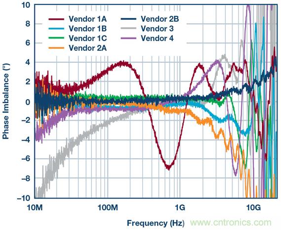 圖3揭示的HD2失真曲線方差量證明,需要進一步考察巴倫的性能,特別是相位和幅度不平衡。以下兩幅圖顯示了不同制造商的幾款巴倫的相位和幅度不平衡。使用網絡分析儀來測量不平衡。