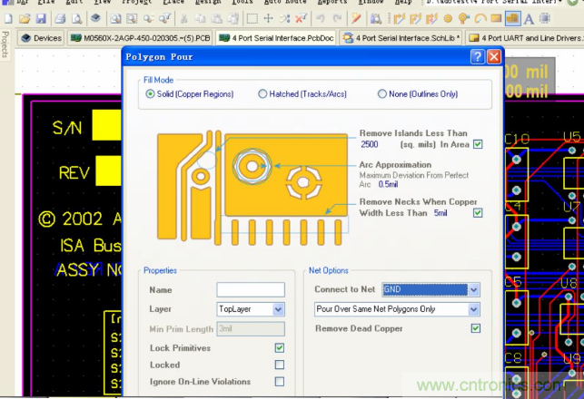 有時(shí)我們?cè)阡佂赉~之后還需要去刪除一些碎銅,現(xiàn)在可以很方便的實(shí)現(xiàn),點(diǎn)擊 Place—Polygon Pour Cutout