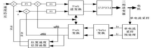 電機(jī)通過單電流采樣得到兩個采樣電流值,通過電流識別方法,計算出三相電流,利用Clarke和Park變換將電流映射到d、q坐標(biāo)系下,估算出角度和速度值,通過結(jié)合了積分分離的PI控制算法,完成對電機(jī)的反饋控制,然后經(jīng)過Park逆變換,生成了新的SVPWM波,完成一次循環(huán)。這里用到的位置、速度估算函數(shù)由于篇幅所限,將另做描述。