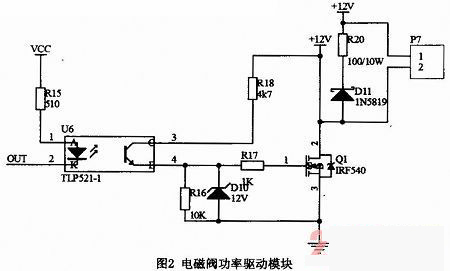 圖2所示的是電磁閥功率驅動模塊。其中,P7插座連接高速電磁閥,電磁閥線圈一端連接電源,另一端連接場效應管漏極。Q1是場效應管IRF540,起放大作用。U6是可控制的光電耦合器件TLP521-1,它廣泛應用于電路之間的信號傳輸,將ECU與負載隔離,可以增加電路的安全性,減小電路干擾,簡化電路設計。當ECU發出驅動信號,光耦導通,穩壓二極管D10將場效應管Q1的柵極電壓穩定在12V,漏極電流增大,漏極電壓被拉低。此時,電磁閥線圈電流增大,線圈產生強大的電動勢,電磁閥被打開。而當光耦截止時,電磁閥關閉,線圈中電路變化很大,會產生反電動勢。R20功率電阻和D11肖特基二極管IN5819與電磁閥并聯,防止場效應管被擊穿。