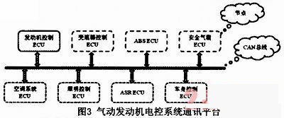 氣動發動機的控制系統是極其復雜的,不僅包括轉速、油門位置等信號的采集處理;還要對電磁閥的噴氣定時和噴氣量完成精確控制等等。另外,氣動汽車上還包括ABS、空調系統和車輛燈光等模塊,這些模塊需要實時共享車輛的數據,以達到整車的最優控制。傳統的電氣控制設計策略已經不能滿足當今電氣控制網絡的需要,而CAN總線的數據通訊具有突出的可靠性、實用性和靈活性等特點。氣動發動機電控系統通訊平臺如圖3所示。它具有布線成本低、通訊速率高和數據傳輸精度高等優勢。