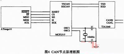CAN節點原理框圖如圖4所示。本文采用TJA1040高速CAN總線收發器作為CAN協議控制器和物理總線之間的接口,選用Mierochip公司推出的MCP2515作為CAN總線控制器,它符合CAN2.0B技術規范并帶有符合工業標準的SPI串行接口。ATmega16通過同步串行接口SPI與MCP2515之間完成高速的全雙工的同步數據傳輸,MCP2515通過CAN物理接口芯片TJA1040連接到CAN總線上,完成氣動發動機電控系統與PC機等的CAN通訊。