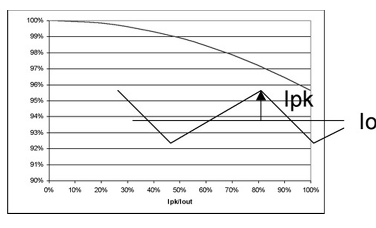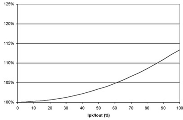 圖4 也闡明了即使在紋波電流較大的時候,對功耗也沒有重大影響。例如,50%的紋波電流僅增加不足5%的功率損耗。當大大超過此水平時,需要減小電源的DC電流以保持結溫不變,從而維持半導體的使用壽命。經驗法則顯示,結溫每降低10%,半導體使用壽命就會延長兩倍。并且,許多設計都傾向于更小的紋波電流,這是因為電感器的限制。絕大多數電感的設計處理能力小于20%的Ipk/Iout紋波電流比率。