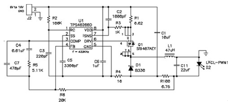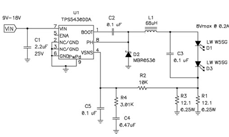 在輸出電壓始終小于輸入電壓的情況下,應使用降壓穩壓器,圖5顯示了該拓撲結構。在該電路中,對電源開關的占空比 (duty factor) 進行了控制,以在輸出濾波器電感 L1 上確立平均電壓。當FET開關閉合時(TPS5430 內部),其將輸入電壓連接到電感器,并在L1中構建電流。D2為環流二極管 (catch diode),可提供開關斷開時的電流路徑。電感器可對流過LED的電流起到平滑的作用,該工作可通過用電阻監控(測量)LED電流,并將電壓與控制芯片內部的參考電壓進行比較,最終進行調節。如果電流太低,則占空比增加,平均電壓也上升,從而也導致了電流的升高。該電路具有極佳的效率,因為電源開關、環流二極管以及電流感測電阻上的壓降非常低。