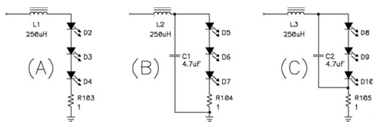 關閉 LED 電源上的電流環路比關閉傳統電源上的電壓環路簡單。環路的復雜性取決于輸出濾波器的配置。圖8顯示了三種可能的配置:只有一個簡單電感器的濾波器(A);一個典型的電源濾波器(B);以及一個修正后的濾波器(C)。