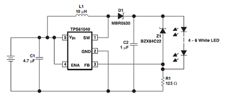 以下電路可生成 101mA 的恒定電流,能為 PDA 和數碼相機等便攜式應用驅動高達 6 個白色 LED">LED。其輸入電壓工作范圍為 1.8 V 至 6 V,可以采用兩節堿性電池或鎳氫電池輸入(1.8 V 到 ~3 V)、三節堿性電池或鎳氫電池輸入(2.7 V 到 ~4.8 V)以及單體鋰離子電池輸入(3 V~4.2 V)。這種升壓轉換器采用 R1 來設置流過 LED">LED 的恒定電流。TPS61040 產品說明書 (SLVS413) 給出了本電路的詳細描述。