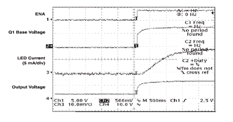 ENA 信號在電路斷開時下降,此時 D2 會阻止 C4 放電。TPS61040 保持開啟狀態,直到 C4 通過 R5 放電。在 TPS61040 仍為開啟狀態時,C3 開始通過 R3 和 R4 放電。隨著 Q1 可用基線電流 (base current) 的下降,Q1 的有效電阻開始升高。隨著 FB 引腳上總電阻的升高,LED">LED 電流會成比例下降。圖 4 顯示了電路斷開時的相關波形。