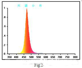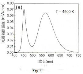 InGaN藍光LED1號熒光粉制成的白光LED的發射光譜示如Fig.6,其光效為55lm/W,色溫4500K。這是本人所知道白光LED的最高光效報導(據測試國內1W白光LED的光通量大多在40lm以下)。采用2號和3號混合熒光粉試制的白光LED的發射光譜示如Fig.7,其顯色指數提高到82,色溫4200K,但光效確降低到20lm/W